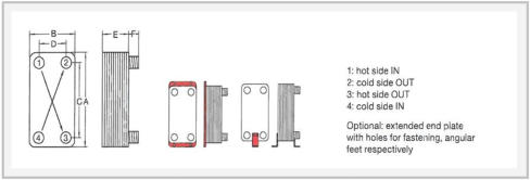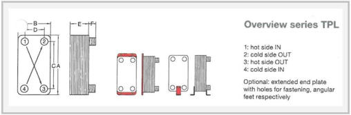 The TPL series ​The TPL series brazed plate heat exchangers is a special development for the demands in mechanical engineering and plant engineering (such as for cooling of hydraulic oil and motor oil).   Compared to units with conventional heat exchanger plates, the TPL volume of the flow gap is up to 80 % larger.  Very high heat transfer rates are obtained using special turbulence sheets inserted in the flow gaps and thermodynamically highly efficient diagonal media flow in combination with maximum diameter connections. Variable design options of these elements allow for optimal adaptation to different applications.  Due to the efficient performance of FRIGOTHERM’s TPL series for media with higher viscosities, the unit can be of a much smaller size compared to conventional plate heat exchangers!  By special request the connections can be on the end plate or on the front and end plate. ​The brazed plate heat exchanger TPL series presents unique advantages, first and foremost of which is the achievement of a high heat transfer rate at a low pressure loss.  The thermodynamically and hydraulically optimised alignment of the turbulence sheets generates high turbulent flow rates even at low volume flows.  This allows for efficient use of the heat exchange area available and leads to perfectly optimised heat transfer.  The high turbulent flow also results in an efficient self-cleaning effect, which greatly reduces maintenance and time-out. As the whole surface of the plates is coated with solder, the resulting brazing allows for a higher integrity joint.  Thus, stresses arising from, for example, variations in pressure or temperature, can be absorbed more effectively compared to conventional brazed plate heat exchangers where only single dots of solder are applied. Application conditions - For the TPL types 00 and 01 the maximum operating pressure is 36 bar, while it is 30 bar for the TPL 02 type.  For all three types the maximum operating temperature is 195 °C. Construction - ​The comapny’s brazed plate heat exchangers series TPL is basically made of non-corrugated stainless steel plates.  In the flow gaps special stainless steel turbulence sheets with high thermal efficiency are inserted.  These are brazed to the basic plates to create a firm and pressure-resistant unit. ​Variable designs of the inserts and the thermodynamically highly efficient diagonal media flow in the flow gaps allow for optimal adaptation to different applications.  By special request, the connections can be on the end plate or on the front- and end plate. Advantages -​ ​With FRIGOTHERM’s brazed plate heat exchangers TPL series a high heat transfer rate at a low pressure loss can be obtained.  The thermodynamically and hydraulically optimised alignment of the turbulence sheets generates high turbulent flow rates even at low volume flows. ​This allows for efficient use of the heat exchange area available and leads to perfectly optimised heat transfer.  The high turbulent flow also results in an efficient self-cleaning effect, which greatly reduces maintenance and time-out.  Furthermore, the TPL type has a compact design and is used for high pressures and temperatures. As the whole surface of the plates is coated with solder, the resulting brazing allows for a higher integrity joint.  Thus stresses arising from, for example, variations in pressure or temperature, can be absorbed more effectively compared to conventional brazed plate heat exchangers where only single dots of solder are applied ​Applications - Typical applications for brazed plate heat exchangers are heating, cooling, condensing - System separation. Cogeneration units. Heat pumps. Hot water / process water. Refrigeration engineering. Economising. Mechanical engineering. Oil cooling. Air drying. Hydraulic oil cooling. Cooling of machines and motors. Mould machine temperature control. Evaporation / condensing in cooling systems. Heating engineering (solar thermal systems, central heating, floor heating). Heat extraction and heat recovery in domestic and process technology. Media - Copper brazed plate heat exchangers TPL are mainly used for media such as: Oil and oil containing fluids, Glycol mixtures, Alcohols, Refrigerants, Gas / air, Water, and Many more (according to media properties and its viscosity). Materials - For the plates as a standard stainless steel 1.4401 / AISI 316 or 1.4301 / AISI 304 is used and the solder is copper.  For the series NPL the solder is nickel. Mounting - Extended end plate. Angular feet. Importantly, angular feet are only used for units with a minimum weight of approximately 10 kg. Insulation (optional) - Heat insulation -  Box with mineral wool with a long-term thermal stability of up to 200 °C.  Outer casing made of AL- Stucco. ​Cold insulation -  Diffusion tight insulation on the basis of nitrile rubber with a long-term thermal stability from - 40 °C up to 105 °C.  Available as self-adhesive multiple part set. The TPLB series Construction - The Cu-free brazed plate heat exchanger series TPLB is basically made of non-corrugated stainless steel plates.  In the flow gaps special stainless steel turbulence sheets with high thermal efficiency are inserted.  These are brazed to the basic plates to create a firm and pressure-resistant unit. Variable designs of the inserts and the thermodynamically highly efficient diagonal media flow in the flow gaps allow for optimal adaptation to different applications.  By special request, the connections can be on the end plate or on the front- and end plate. Advantages - With the brazed plate heat exchangers TPLB series a high heat transfer rate at a low pressure loss can be obtained.  The thermodynamically and hydraulically optimised alignment of the turbulence sheets generates high turbulent flow rates even at low volume flows. ​This allows for efficient use of the heat exchange area available and leads to perfectly optimised heat tra