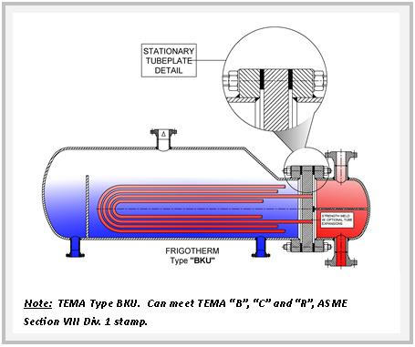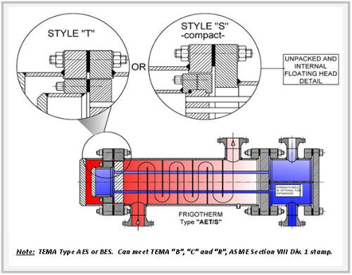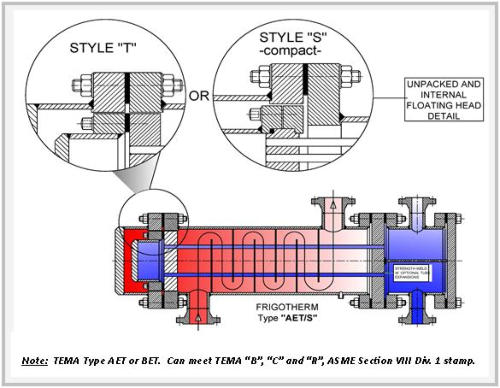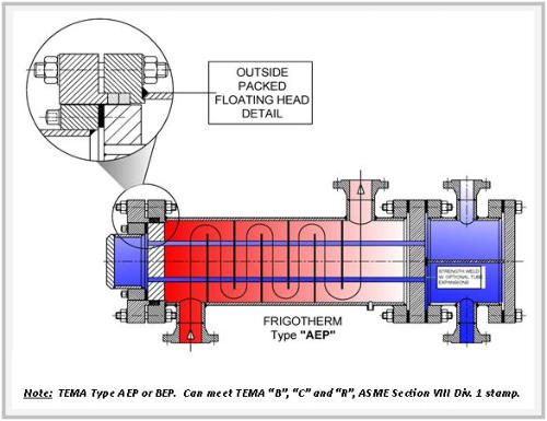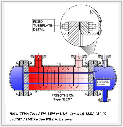 The benefits of FRIGOTHERM’s shell and tube heat exchangers Since cylinders and spheres exhibit the best yield strength when under pressure, it is not surprising that shell and tube heat exchangers are unbeatable when it comes to handling high pressure media, usually coupled with relatively high tempera- tures. This makes them robust and fault tolerant, another advantage that is unscrupulously exploited in many a rough industry.  Furthermore, since they are easily disassembled, cleaning them is also no difficult feat to perform.  In summary, the benefits of FRIGOTHERM shell and tube heat exchangers are as follows: Extensive design, materials and performance flexibility: o Design options include fixed tubesheets, floating tubesheets and removable bundles, manufactured in single- or multi-pass, straight or as a U-tube. o Material options include steel, stainless steel, copper, bronze, nickle, exotic alloys and titanium. This extensive flexibility results in tailored heat exchangers that perfectly match your specific heat transfer needs. High pressure and temperature handling capability. Capable of handling a wide range of fluids – ranging from water to oil to process and corrosive fluids – and gasses. Highly cost competitive. All of these are crucial advantages.  When compared to plate heat exchangers, however, they are the least effective when it comes to heat transfer coefficients and ratios like kW per kg. Nonetheless, when safety and a high degree of reliability and maintainability are important requirements, then this product is preferable. Crucial factors to consider:  standardised or customised The section that now follows provides a detailed outline of FRIGOTHERM’s range of customisedised shell and tube heat exchangers, all built in accordance with TEMA guidelines. Type AEW or BEW Specifications - Straight tube, removable bundle, packed floating tubesheet. Single- or two- pass tube arrangements for maximum efficiency over a wide variety of tube side flow rates. Standard shell sizes from 3 inches through to 22 inches in diametre; custom designs up to 42 inches in diametre. Available in horizontal and vertical installations as well as stacked assemblies. Standard design capabilities - Advantages - Floating tubesheet allows differential expansion between the shell and tubes. Maximum tube count per shell diametre. Shell side can be steam or mechanically cleaned. Bundle can be easily replaced or repaired. Less costly than full internal floating head-type construction. Limitations - Both shell side and tube side are exposed to packing, therefore volatile and / or toxic fluids should be avoided. Packing limits design pressure and temperature for both shell and tube sides. Type AEP or BEP Specifications - Straight tube, removable bundle, outside- packed floating head. Single- or multi- pass tube arrangements for maximum efficiency over a wide variety of tube side flow rates. Standard shell sizes from 6 inches through to 22 inches in diametre; custom designs up to 42 inches in diametre. Available for horizontal or vertical mounting. Standard design capabilities - Note: Custom designs to 3,600 psi / 24,816 kPa and 1,000 °F / 538 °C, depending on shell diametre and design temperature. Advantages - Floating tubesheet allows differential expansion between the shell and tubes. Shell side can be steam or mechanically cleaned. Bundle can be easily replaced or repaired. Less costly than full internal floating head-type construction. Only shell side fluids are exposed to packing. Volatile or toxic fluids are possible on the tube side. Provides a large bundle entrance area. Limitations - Shell side is limited to non-volatile and /or non-toxic fluids. Shell side packing limits design pressure and temperature. Less surface per given shell and tube size than the Type AEW or BEW designs. Type AEM or BEM Specifications - Straight tube, fixed tubesheet, removable channel or bonnet, or integral channel. Single- or multi-pass tube arrangements for maximum efficiency over a wide variety of tube side flow volumes. An expansion joint can be added to compensate for severe temperature differentials. Standard shell sizes from 5 inches through to 22 inches in diametre; custom designs up to 42 inches in diametre. Available for horizontal or vertical mounting. Standard design capabilities - Note: Custom designs to 3,600 psi / 24,816 kPa and 1,000 °F / 538 °C, depending on shell diametre and design temperature. Advantages - Less costly than removable bundle exchangers. Provides maximum heat transfer surface area per given shell and tube size. Easily interchangeable with designs of various other manufacturers. Tube side can be steam or mechanically cleaned. Only tube side fluids are exposed to gaskets.  Volatile or toxic fluids are possible on the shell side. Easy accessibility for tube side cleaning and inspection. No packed joints. Limitations - No provision for differential expansion of tubes and shell. Shell side may not be mechanically cleaned. Type AEU or BEU Specifications - U-tube, removable bundle or suction-heater (open-end shell) construction. Multi-pass tube arrangements for maximum efficiency over a wide variety of tube side flow volumes. Standard shell sizes from 5 inches through to 22 inches in diametre; custom designs up to 42 inches in diametre. Available for horizontal or vertical mounting. Standard design capabilities - Note: Custom designs to 3,600 psi / 24,816 kPa and 1,000 °F / 538 °C, depending on shell diametre and design temperature. Advantages - Allows for differential thermal expansion between shell and tubes as well as between individual tubes. High heat transfer surface area for given shell and tube size. Capable of withstanding thermal shock. The most economical of all shell and tube exchangers, and the least expensive of all basic designs. Shell side can be steam or mechanically cleaned. Bundle can be removed for shell side cleaning and maintenance. Limitations - Indivi